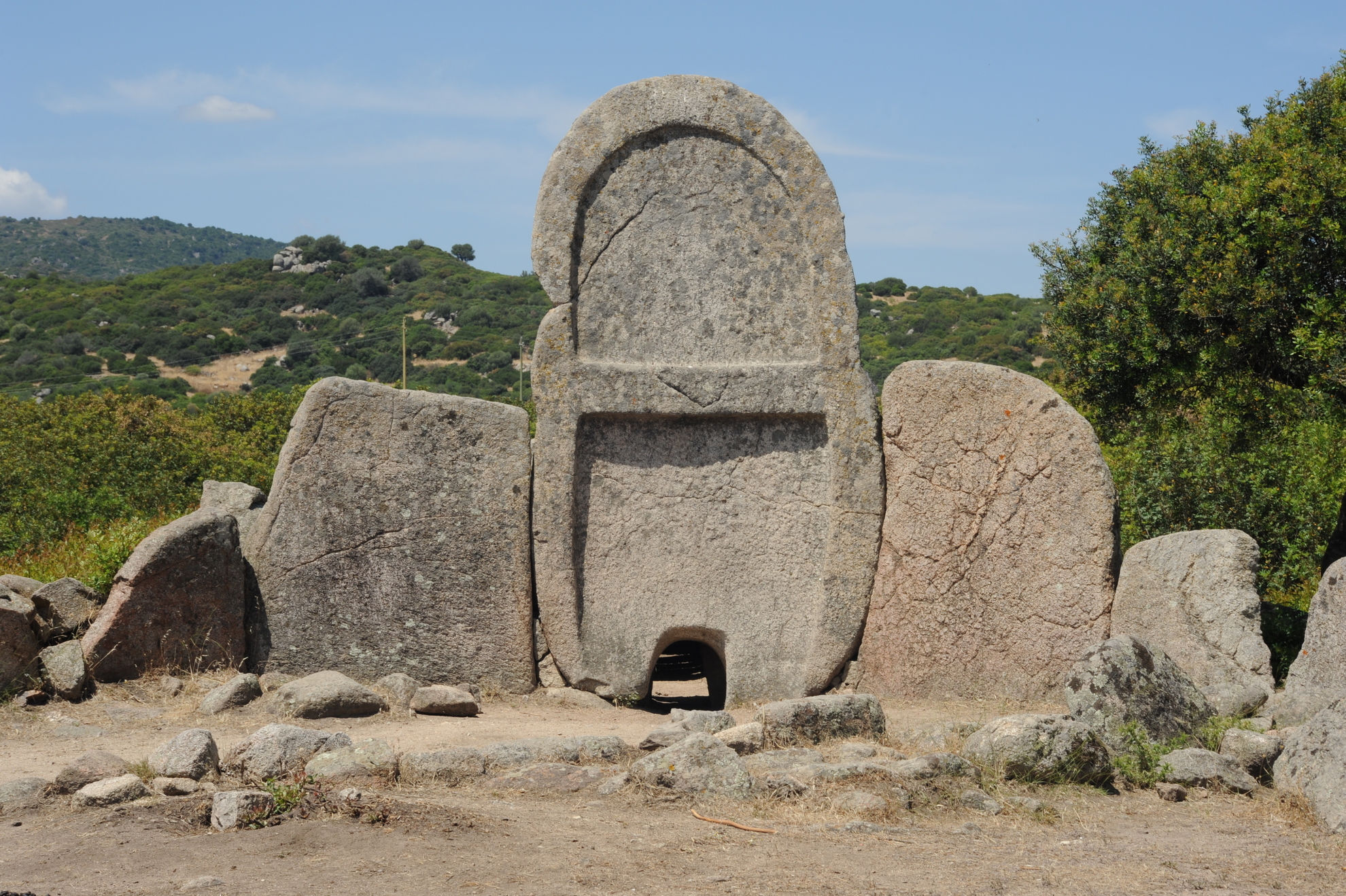 Avvertirai un’impressione di arcaicità e monumentalità. La stele granitica con bordi levigati pesa sette tonnellate e sta al centro di un’esedra, ossia un semicerchio di lastroni di pietra, infissi ‘a coltello’ nel terreno, a forma di corna taurine, con dimensioni decrescenti dal centro verso le estremità. L'esedra delimita l’area sacra, dove erano officiati ancestrali riti funerari. Nella stele è scavata una porticina simbolica, l’accesso agli Inferi, così piccola da essere inaccessibile ai vivi. Alle spalle, quasi intatto, c’è il corridoio funerario a dolmen, lungo 11 metri, con copertura a piattabanda: le lastre di pietra sono disposte orizzontalmente lungo le pareti. L’orientamento della camera mortuaria, insolito rispetto a quello ‘orientale’ di molte altre tombe nuragiche, è verso sud. È così anche nelle sepolture di Goronna (Paulilatino) e Baddu Pirastru (Thiesi). Secondo leggenda, le tombe dei giganti erano usate da esseri enormi: le dimensioni ciclopiche chiariscono l’origine del nome. In realtà, erano sepolture collettive. Anche s’Ena ‘e Thomes conferma che per i nuragici la morte non fa distinzioni: negli scavi sono stati rinvenuti scarni corredi funerari, che non evidenziano disparità sociali. Rimane il dubbio tra fossa comune o riservata a una sola classe (aristocratica). Sono considerati, inoltre, luoghi di emanazione energetica: ricercatori, spiritualisti e curiosi le visitano alla ricerca di guarigioni fisiche o rigenerazioni spirituali. Nell’antico rituale, diffuso anche nella cultura greca, si cadeva in un sonno-trance, entrando in contatto con la divinità.