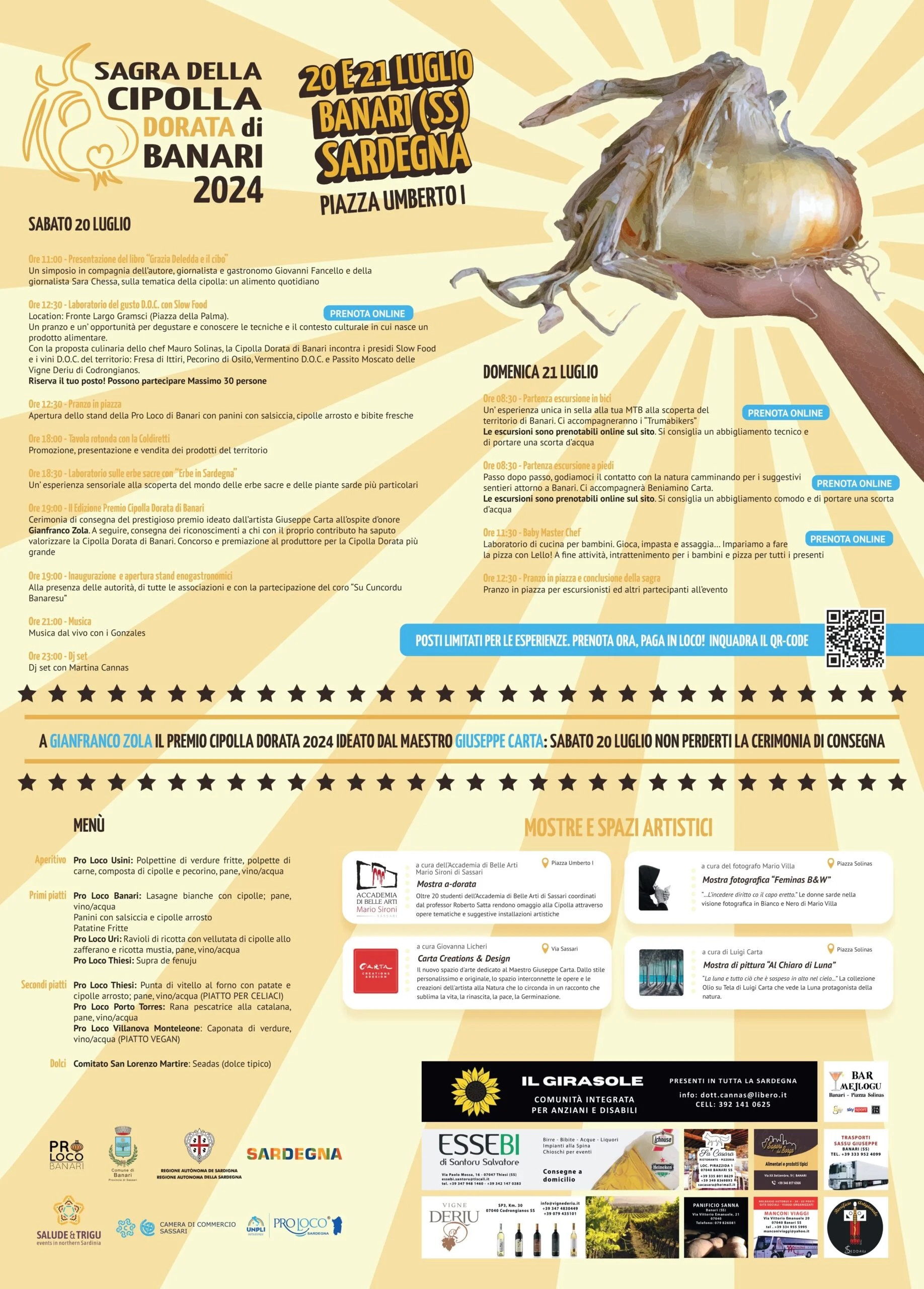 La maggior parte degli appuntamenti si svolge o prende il via in Piazza Umberto I. Il programma parte sabato 20 alle 11 con la presentazione del libro 'Grazia Deledda e il cibo'. Alle 12.30, in Piazza della Palma, Laboratorio del gusto D.O.C. con gli esperti Slow Food: occasione per scoprire gli abbinamenti tra la Cipolla Dorata, i presidi Slow Food e i vini DOC del territorio. Alla stessa ora, apertura dello stand della Pro Loco di Banari con proposte street food. Nel pomeriggio, dalle 18 Tavola rotonda con la Coldiretti; mezz'ora più tardi, laboratorio 'Erbe in Sardegna' sulle Erbe Sacre; alle 19, 2^ edizione del Premio Cipolla Dorata di Banari, conferito in questa occasione a Gianfranco Zola. Alle 19 inaugurazione e apertura degli stand enogastronomici con esibizione de 'Su Cuncordu Banaresu', a seguire musica dal vivo e DJ set.