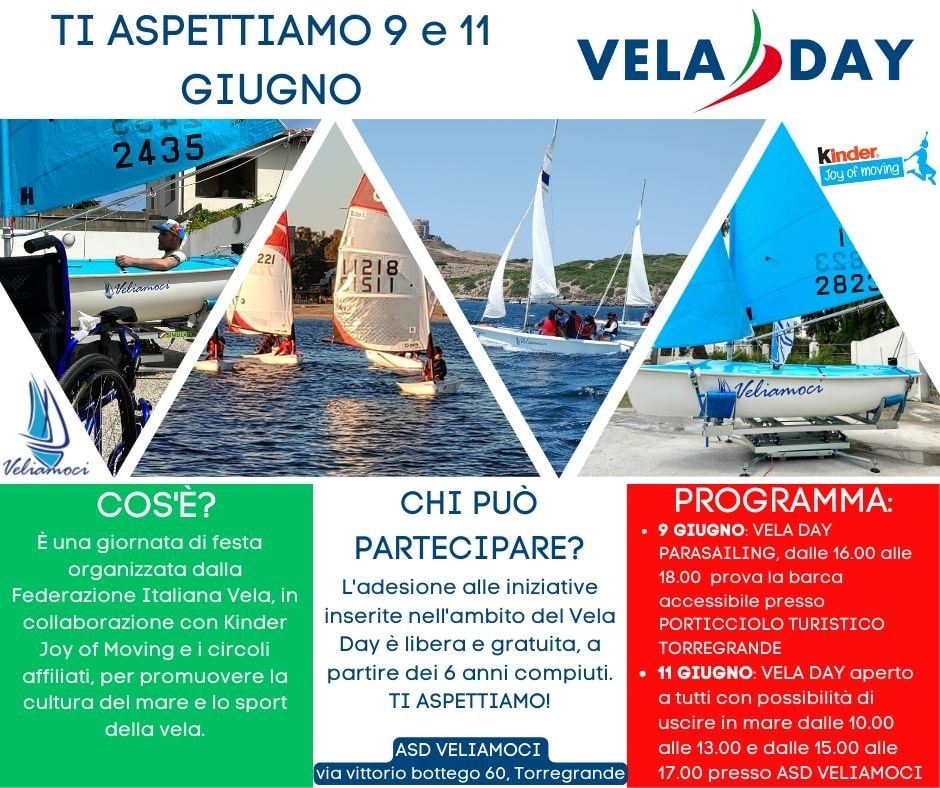 Venerdì 9 e domenica 11 giugno, porte aperte da Veliamoci nella marina di Torregrande per celebrare il Vela Day: si tratta di due importanti giornate di festa organizzate dalla Federazione Italiana Vela in collaborazione con Kinder Joy of Moving e i circoli affiliati, l’obiettivo è quello di promuovere la cultura del mare e lo sport velico.